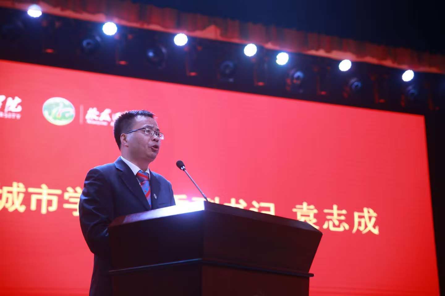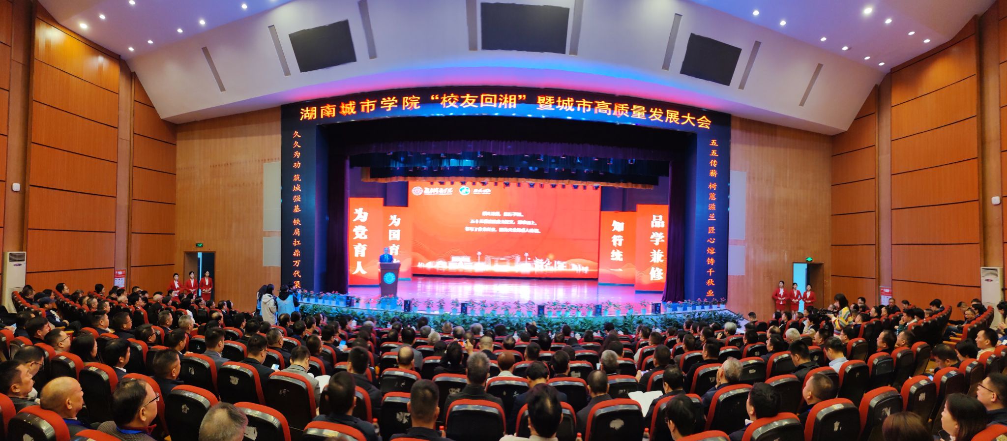 校园内彩旗高挂,巨大的宣传展板分外醒目,广大校友从大江南北回到魂牵梦萦的母校。学校音乐厅内洋溢着欢庆祥和的浓厚氛围,悠扬的音乐不绝于耳,璀璨的灯光交相辉映,大屏幕循环播放学校办学55周年主题宣传片《城市之光》,舞台两侧“五五传薪 树蕙滋兰 匠心熔铸千秋业”“久久为功 筑城强基 铁肩扛鼎万代梁”的对联异常显眼。四百余名校友、嘉宾、师生代表齐聚一堂,共话城院校友情谊,共襄城市发展蓝图。